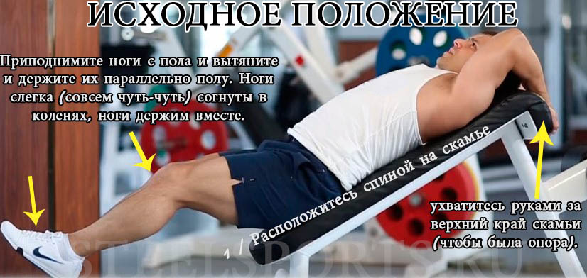 - Лечь на лавку на спину, выпрямить и сжать ноги (пятки на весу). Согнутыми в локтях руками ухватиться за опору за головой – край лавки, перекладину лестницы, упоры-держатели.