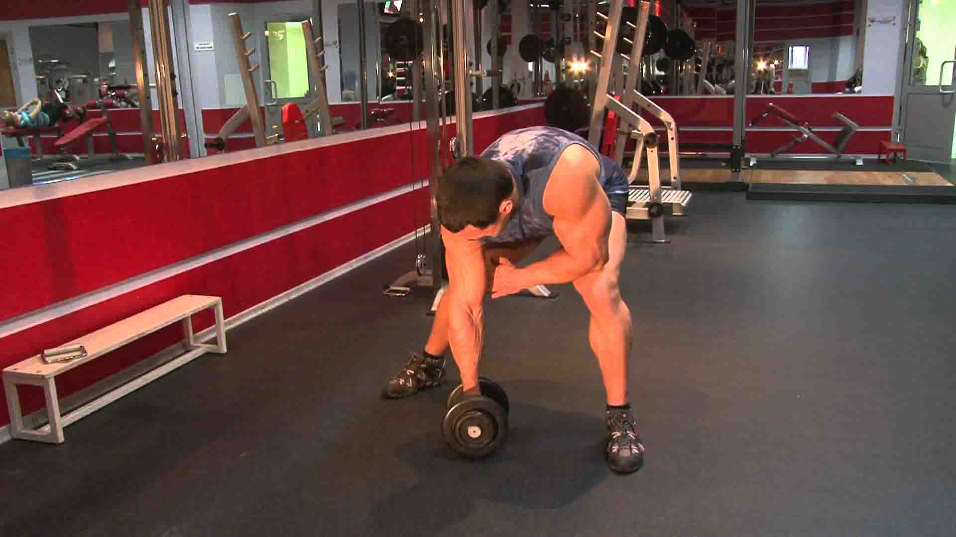 1. Стоя, наклоните тело в перёд, возьмите гантель в одну руку, а второй можете упереться в колено или какой-нибудь другой предмет для устойчивости.
